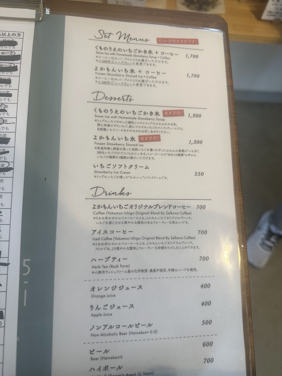 For a delightful experience, don’t miss the “よかもんいち氷”, a fluffy strawberry shaved ice that melts in your mouth, with optional toppings like condensed milk and whipped cream for added indulgence. The menu also offers refreshing drinks, including a surprisingly delightful green tea.